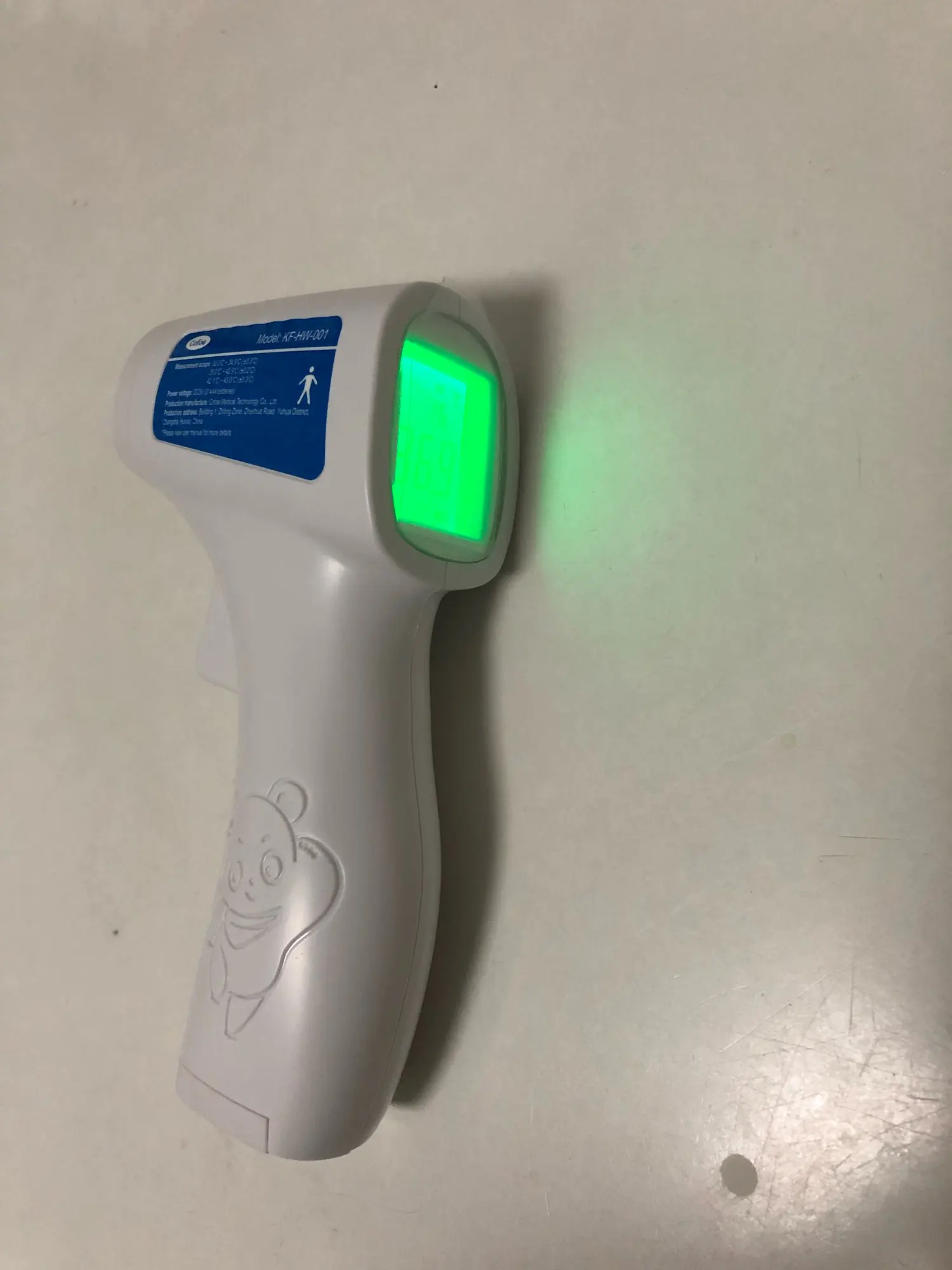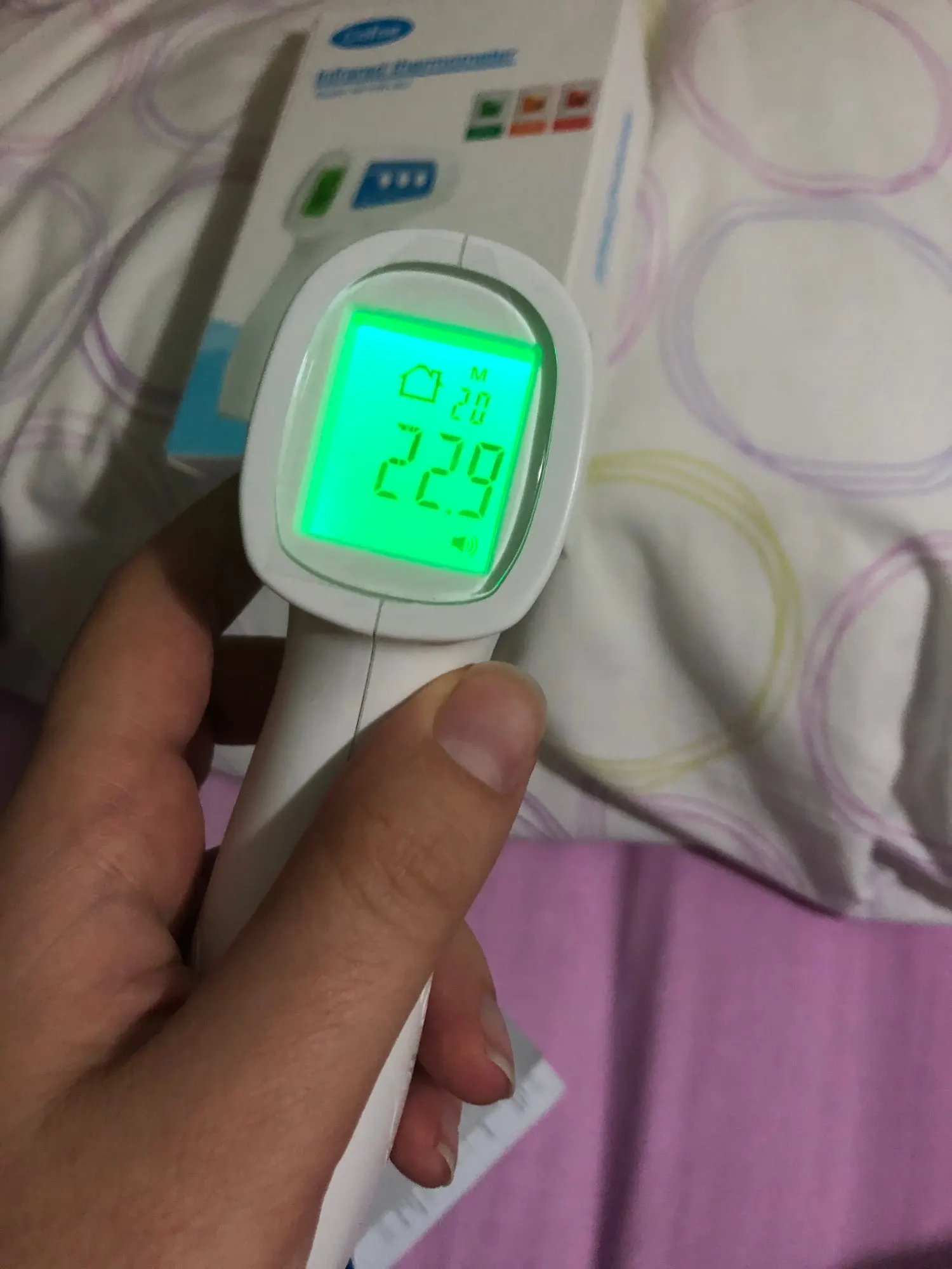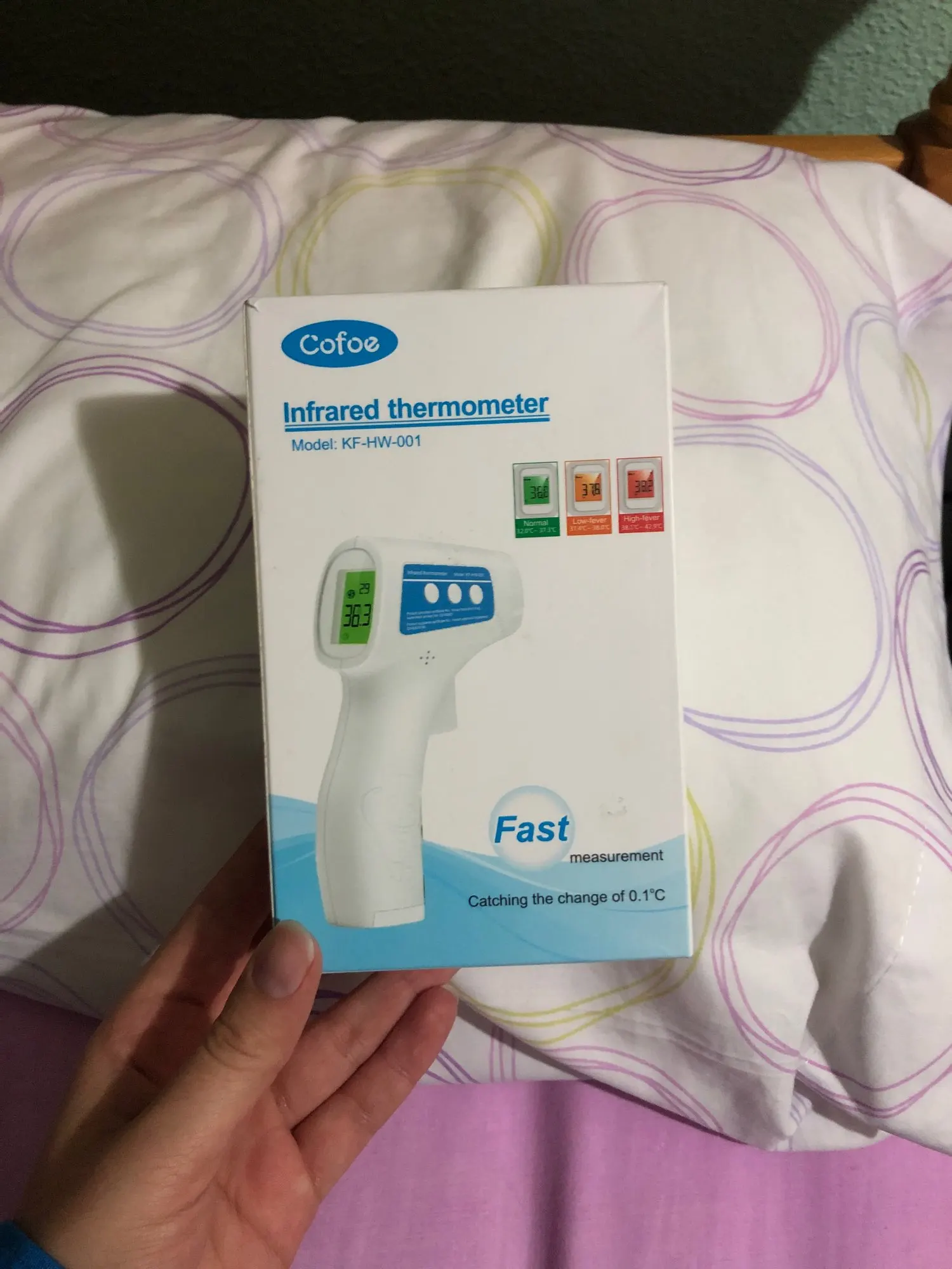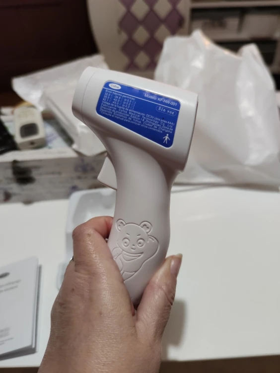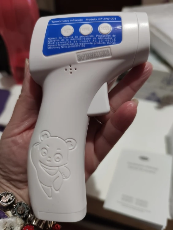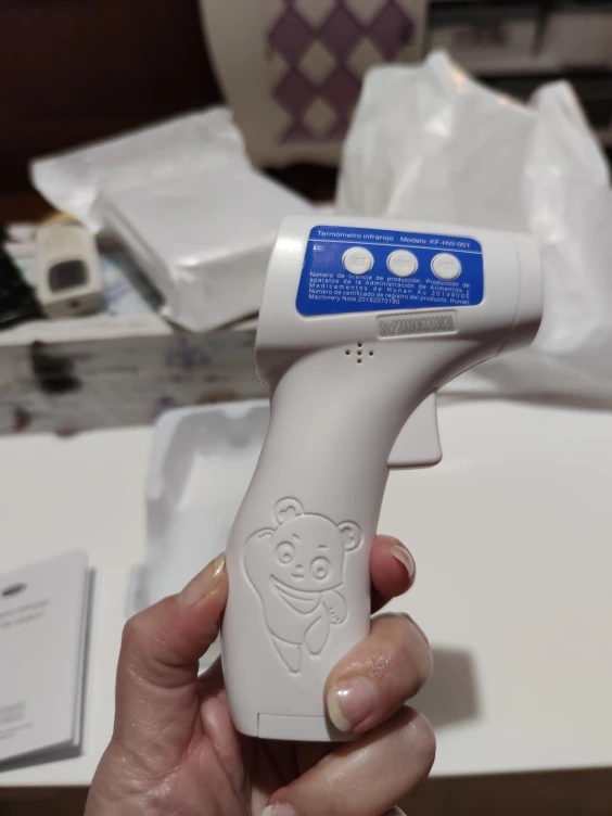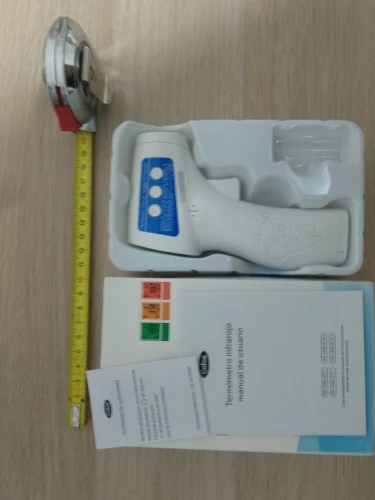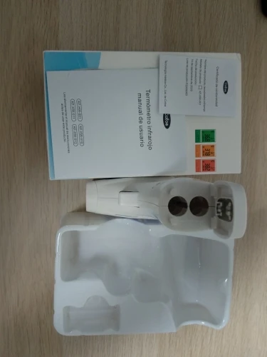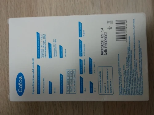 Compré este termómetro porque se supone que es un poco mejor que otros similares. La pantalla cambia de color según estados de fiebre: verde, naranja y rojo. Mediciones en grados Celsius y Fahrenheit. No se incluyen pilas. De momento va bien. La única pega es que la tapa del compartimento de las pilas parece demasiado endeble.